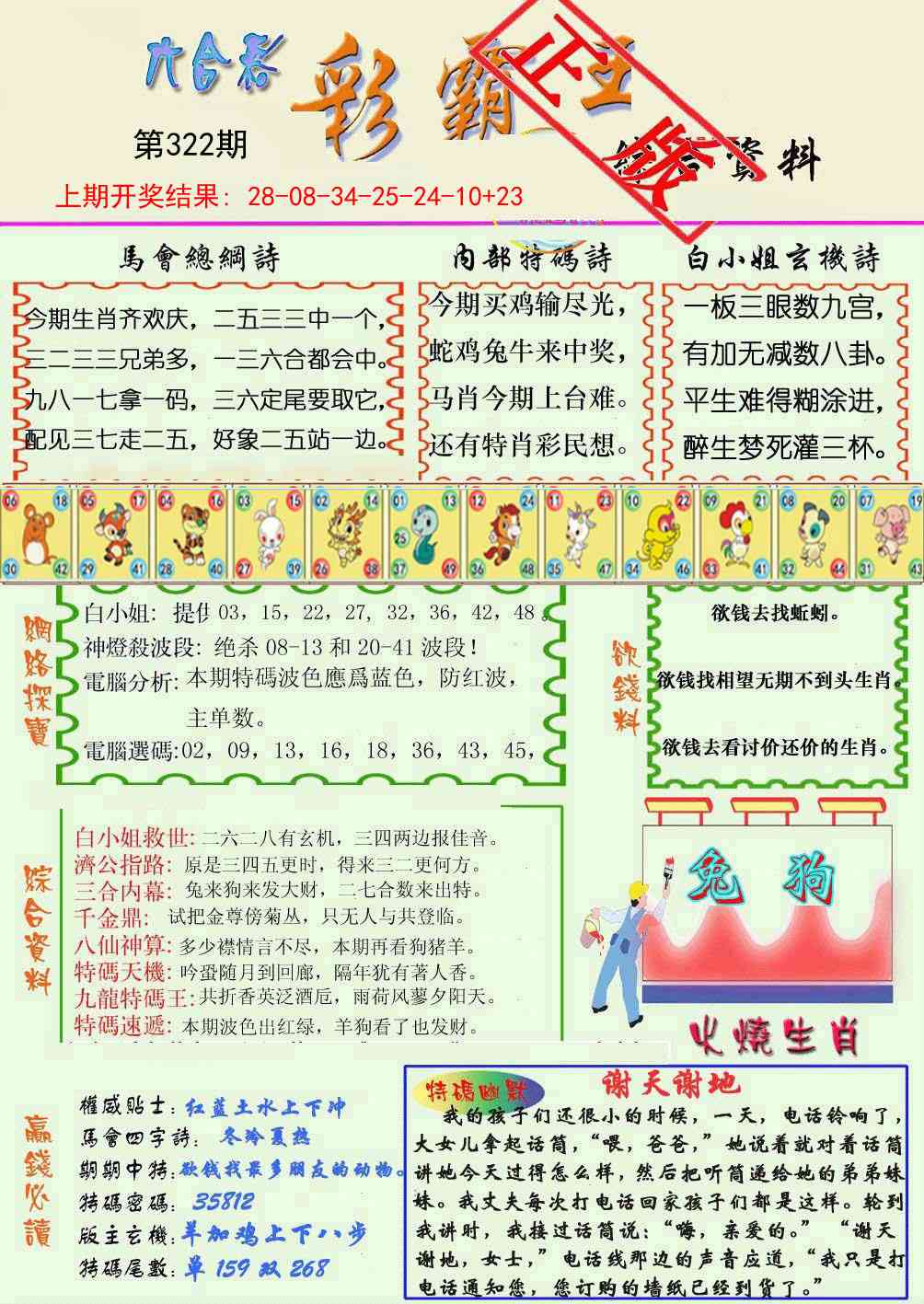 | 320期 33-40-20-48-34-07 T28 34=猪狗鸡猴羊马蛇√ |